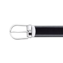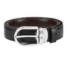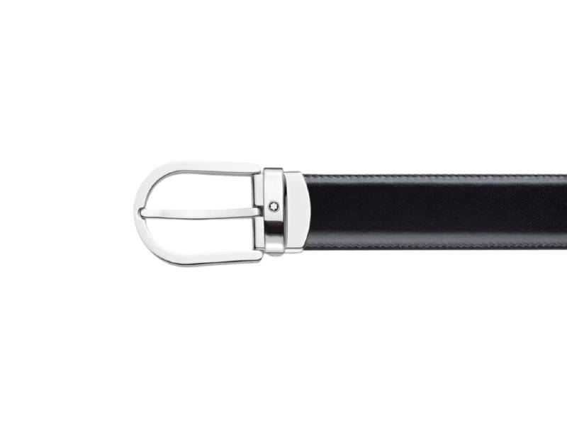 Shiny palladium finish horseshoe pin buckle with engraved Montblanc brand name on the sides and Montblanc emblem. Self-adjustable, 3 cm x 120 cm, reversible black/brown leather strap. Refined and understated, for any kind of look.