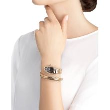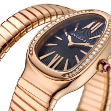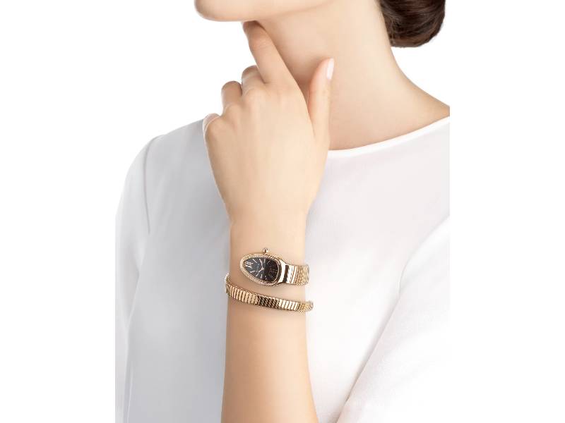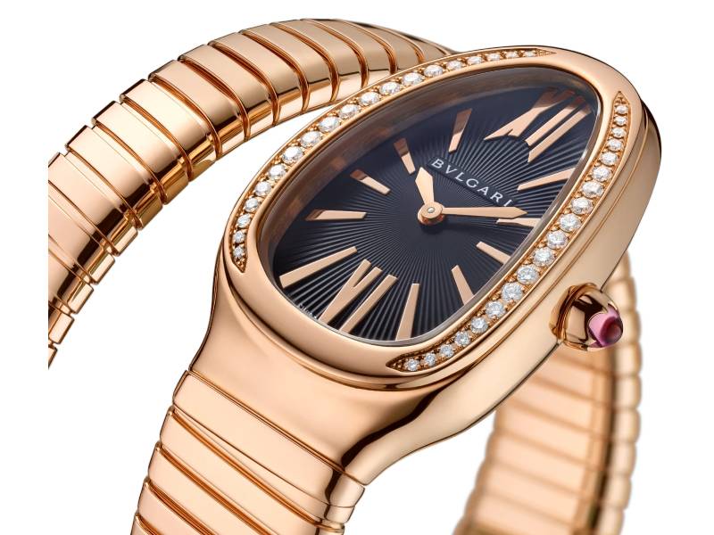 Merging two of the most iconic symbols of Bulgari design, the Serpenti Tubogas watch coils the sinuosity of the snake with the contemporary soul of tubogas. Evoking both the sensual curves of a woman and the fluid shape of the serpent, the timepiece is crafted with the shapely lines of this specific technique, with a flexible and tubular litheness. Radiating glamour and a truly individual style, this watch marks a distinctive chapter in the constant evolution of Serpenti. Serpenti Tubogas watch with quartz movement, 35 mm 18 kt rose gold curved case set with brilliant cut diamond, 18 kt rose gold crown set with a cabochon cut pink rubellite, black opaline dial with guilloché soleil treatment and hand-applied indexes, single spiral 18 kt rose gold bracelet.