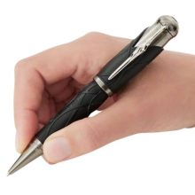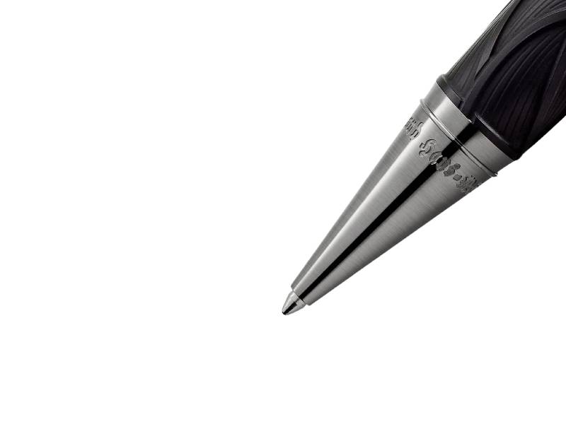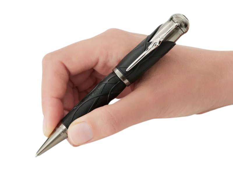 “Once upon a time…” The Montblanc Writers Edition Homage to Brothers Grimm is dedicated to Jacob and Wilhelm Grimm and celebrates their work on German and European folk tales among which are some of the most famous fairy tales such as “Snow White”, “Cinderella” and “Sleeping Beauty”. The overall silhouette of the writing instrument is shaped like an old hiking stick and the Black colour resembles the darkness of the woods which usually serve as the main stage for the Brothers Grimm´s folklore. In addition, the wave-like pattern on the cap and barrel is inspired by Rapunzel´s hair while also resembling roots as the Brothers Grimm viewed their linguistic work as “research into roots”. The cap is crowned by the Montblanc Emblem in precious resin. The platinum-coated clip, reminiscent of a knobby piece of wood, surprisingly reveals the silhouette of the profile of the Brothers Grimm when turned.