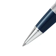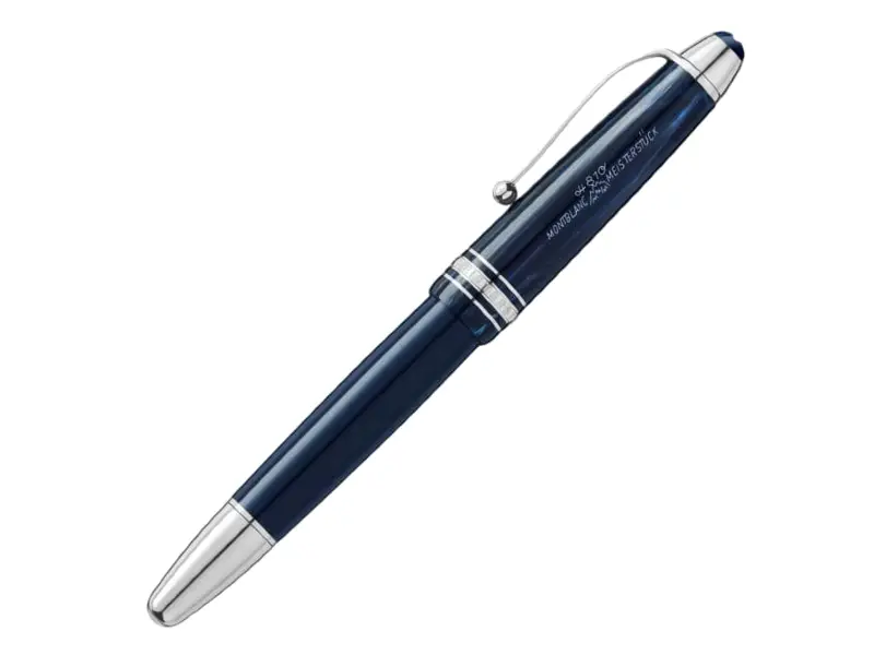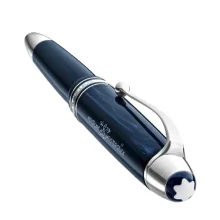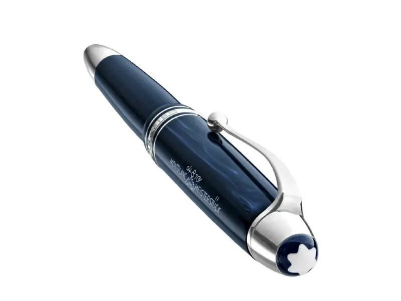 Cap: Expertly crafted from blue precious resin, the cap features a fluid pattern inspired by early designs, representing the dissolution of ink onto paper, elegantly contrasted by platinum-coated fittings. Upon closer inspection, one can discover the original Meisterstück logo, which has adorned the cap as a symbol of high quality since its inception. This jubilee edition is decorated with a special cap ring showing the years 1924 and 2024 .