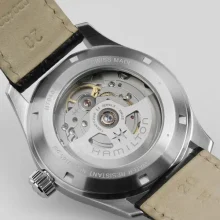 Calibro: H-10. Movimento a tre sfere con data e riserva di carica superiore di 80 ore, l’H-10 presenta elaborati motivi colimaçon e perlati a contrasto per i modelli American Classic e superfici pulite per gli orologi da pilota.