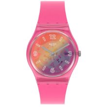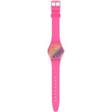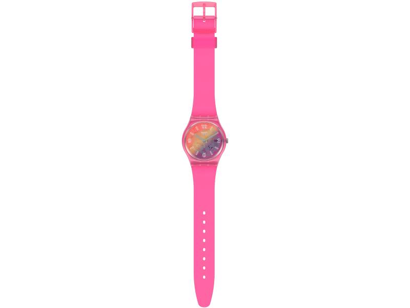 Questo orologio colorato è caratterizzato da un cinturino in silicone rosa opaco trasparente e da una cassa in plastica di colore rosa brillante, con un quadrante a gradiente multicolore che risalta davvero.